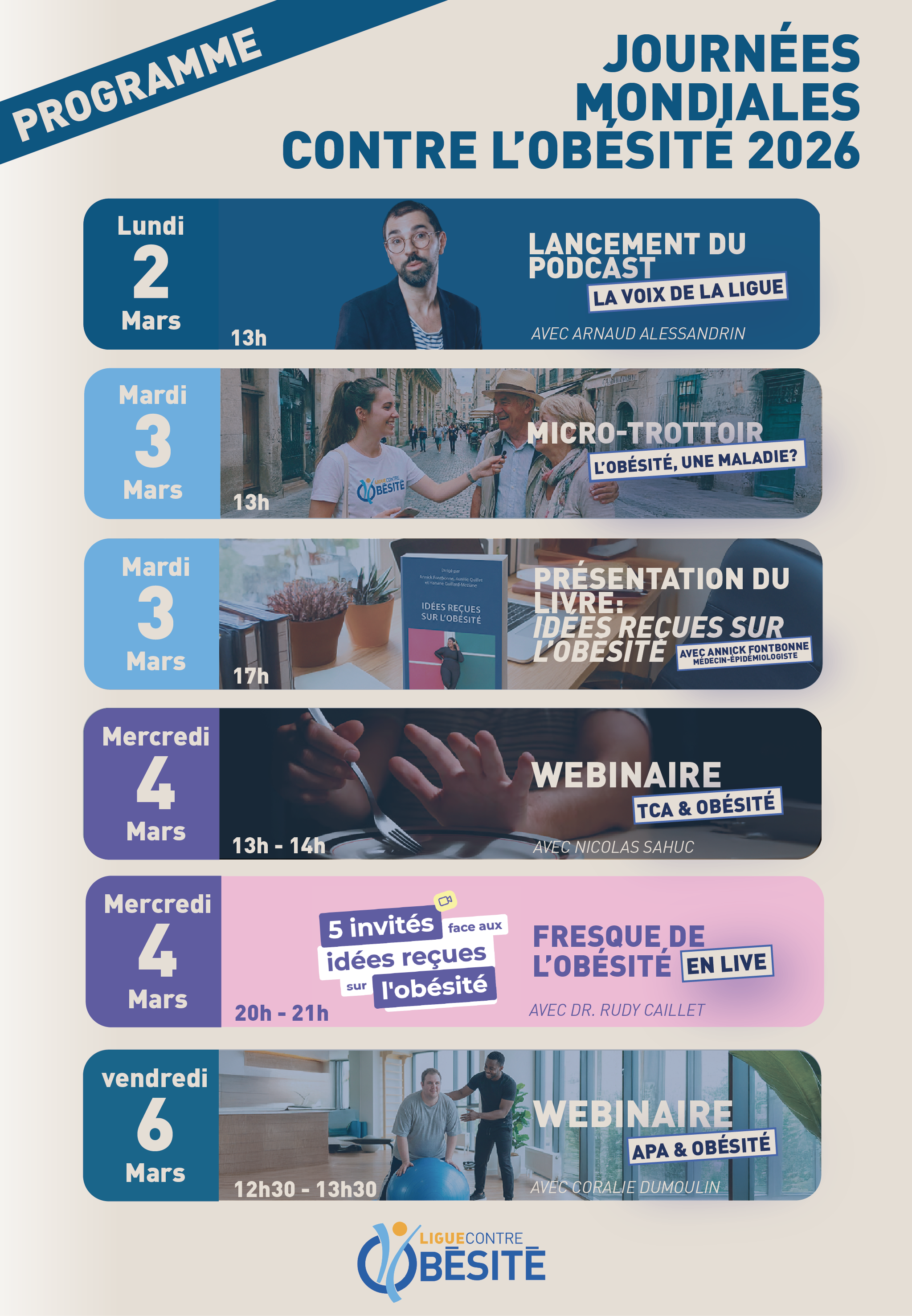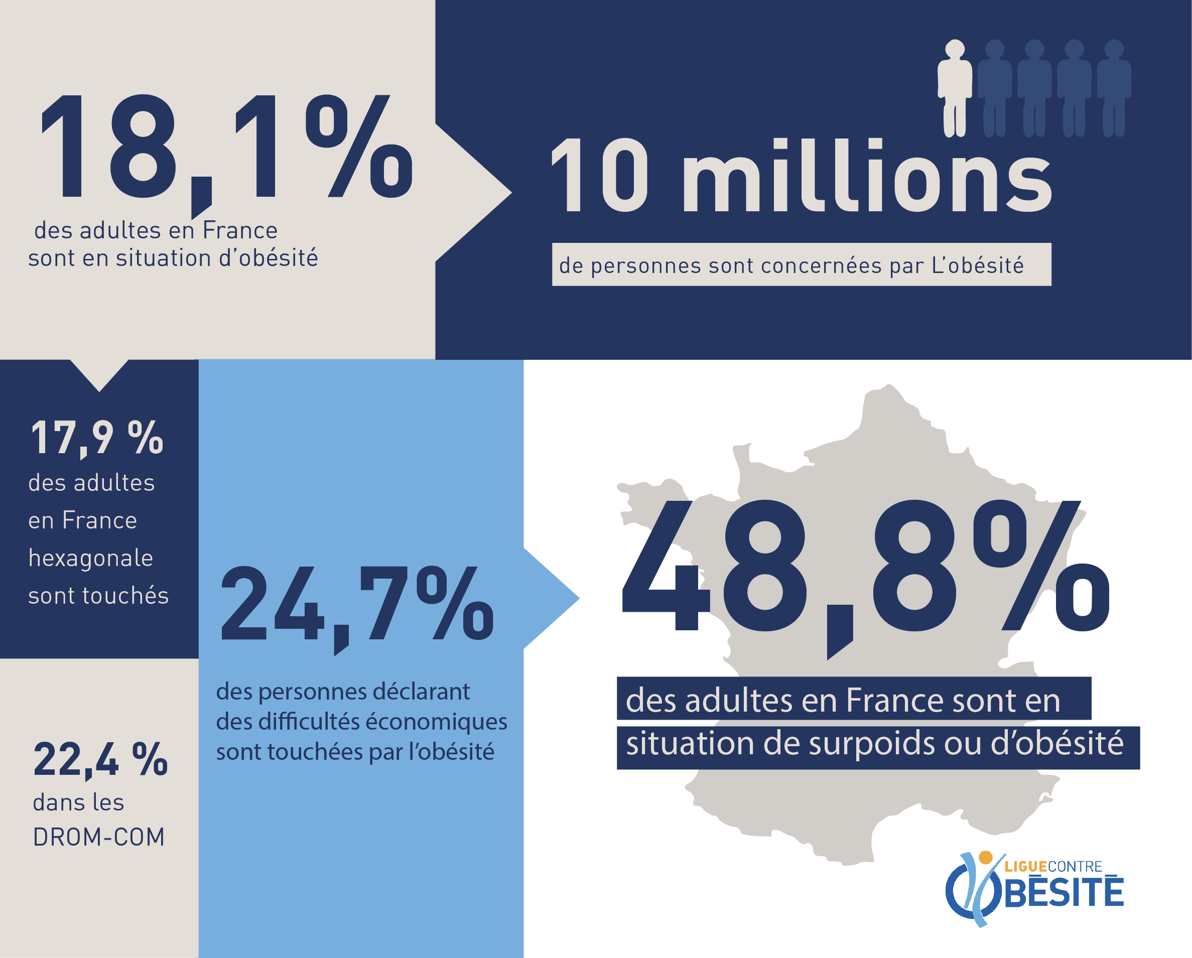 La Ligue nationale Contre l’Obésité coordonne l’action des associations de patients sur l’ensemble du territoire français. Présente dans toutes les régions à travers ses antennes départementales et forte d’un réseau de 9 000 membres, la Ligue nationale Contre l’Obésité fédère des professionnels de santé, des structures associatives, des patients, des proches de victimes de l’obésité, des bénévoles et des entreprises partageant les mêmes valeurs humanistes en vue de créer un réseau efficient pour les personnes en situation de surpoids et d’obésité sur le territoire national et européen. La Ligue nationale Contre l’Obésité développe aussi des compétences de terrain et la pratique du partenariat soignants/soignés. La Ligue nationale Contre l’Obésité revendique, sans moralisation ni culpabilisation, une fibre militante en faveur de la reconnaissance de l’obésité comme une maladie à part entière par les décideurs publics.